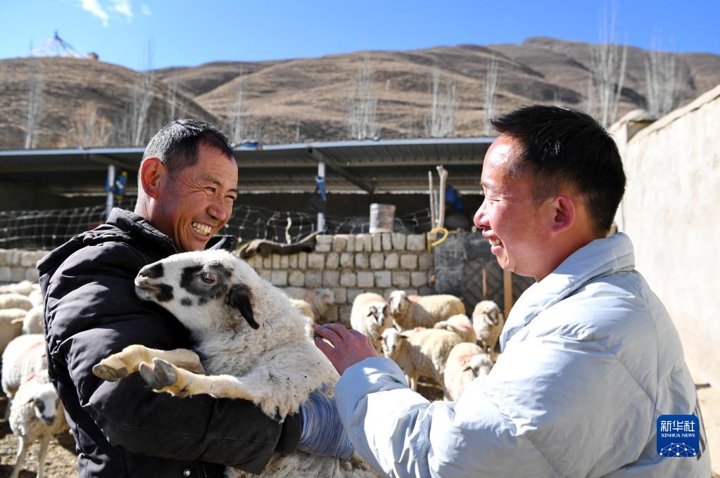 西卡學村養(yǎng)殖合作社負責人邊覺(左)在向西卡學村黨總支第一書記兼駐村工作隊副隊長李德林介紹綿羊養(yǎng)殖及銷售情況(4月5日攝)。新華社記者 張汝鋒 攝