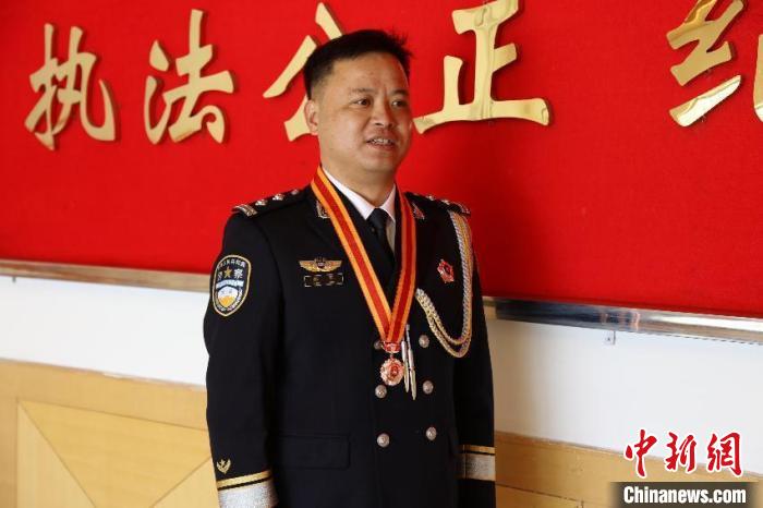 圖為獲得銅質(zhì)紀(jì)念章的民警楊軍。 格熱 攝