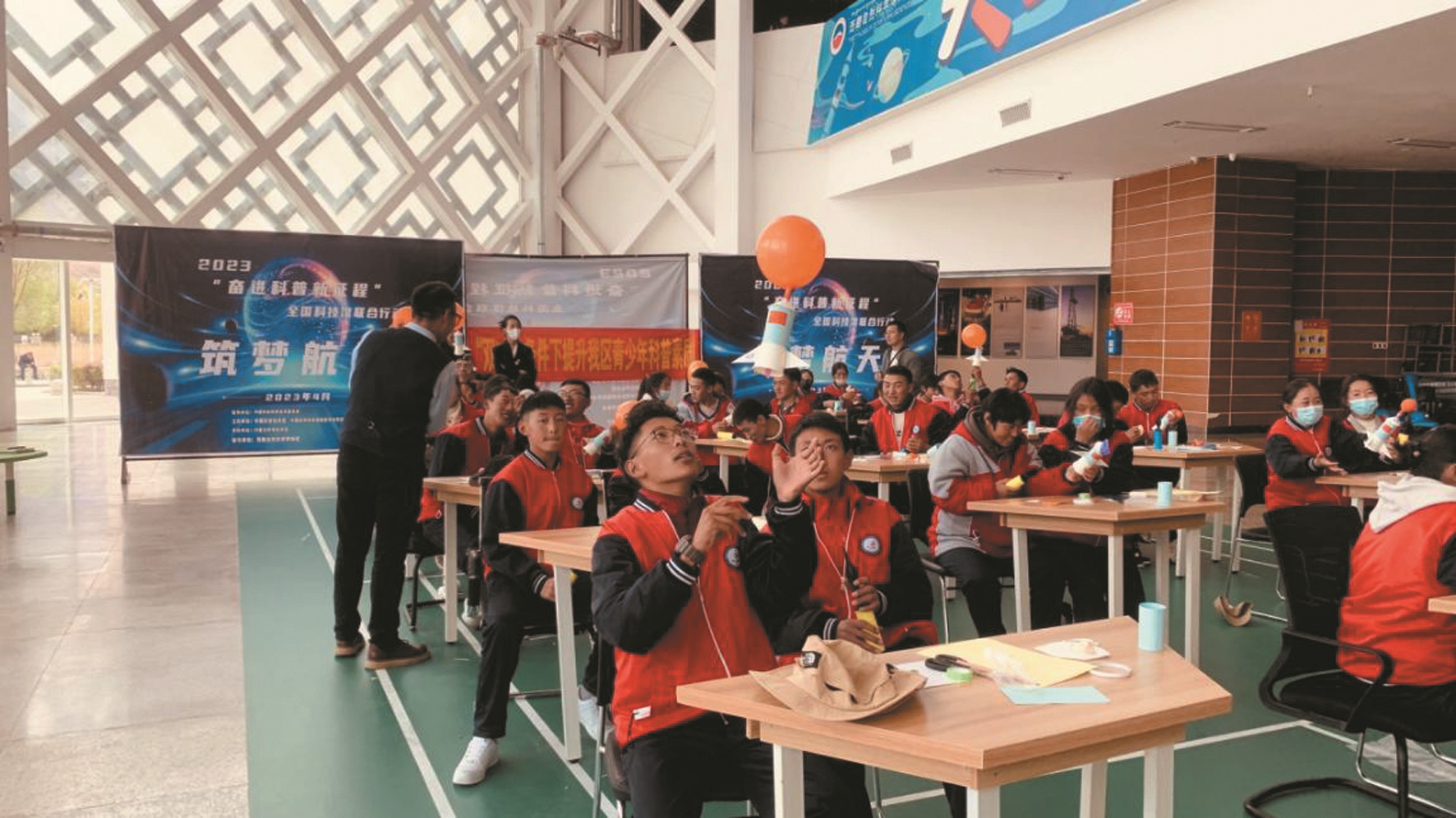 圖為在“筑夢航天”科普活動中,拉薩市第二職業(yè)技術學校學生們跟隨科技輔導員一起探索火箭升空的奧秘。 拉薩融媒記者 小索朗曲珍攝