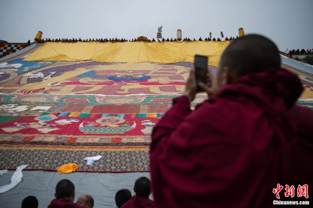 西藏拉薩哲蚌寺舉行展佛活動,僧人用手機記錄。何蓬磊 攝