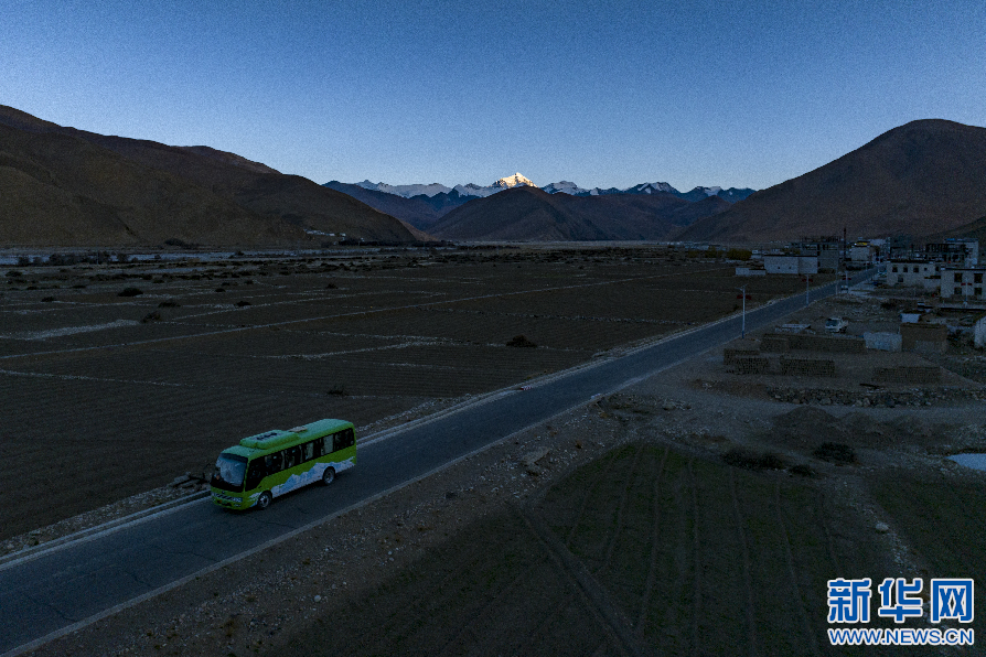 遠(yuǎn)處的珠穆朗瑪峰與正在行駛的環(huán)保大巴(無人機(jī)照片)。新華網(wǎng) 旦增努布 攝