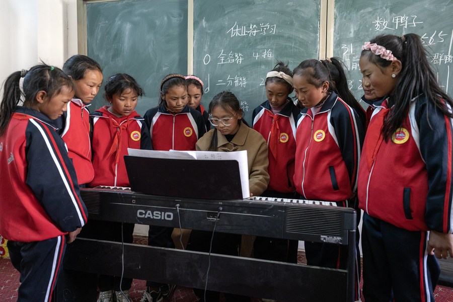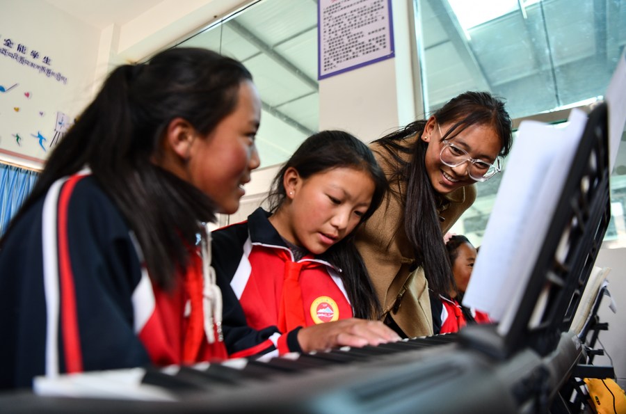 6月5日,扎西宗鄉(xiāng)完全小學(xué)的鋼琴課老師巴桑(右)在給學(xué)生指導(dǎo)指法?! ?/p>