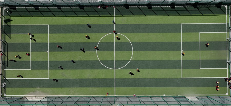 扎西宗鄉(xiāng)完全小學(xué)的學(xué)生在體育課上踢足球(6月5日攝,無人機(jī)照片)。