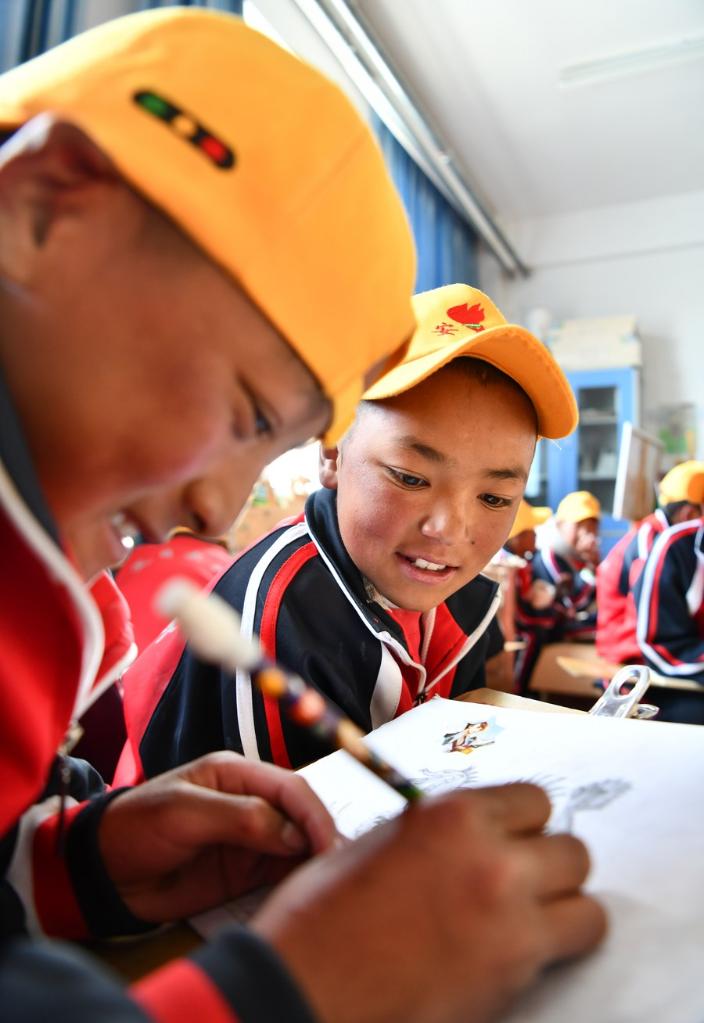 扎西宗鄉(xiāng)完全小學(xué)的學(xué)生在上美術(shù)課(6月5日攝)。
