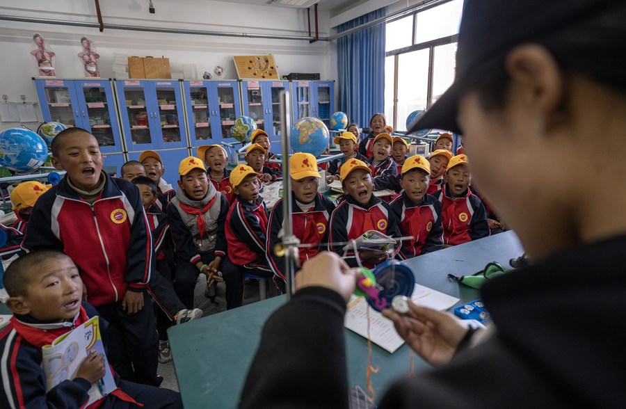 6月5日,扎西宗鄉(xiāng)完全小學(xué)的副校長旦巴仁青在給學(xué)生上科學(xué)課。