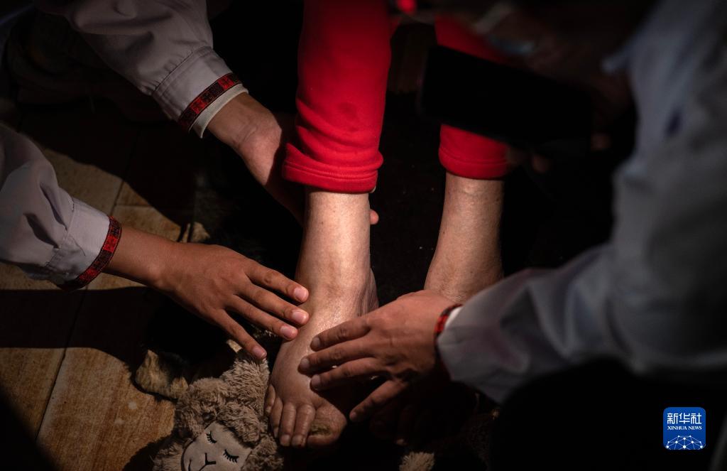 6月12日,王振疆(右一)和尼瑪益西(右下)在吞不絨村為阿珍診治。新華社記者 費茂華 攝