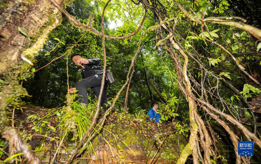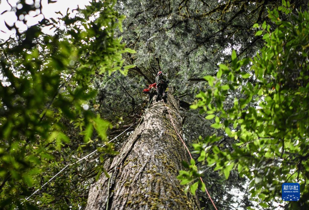 6月15日,國家重要野生植物種質(zhì)資源庫辰山中心負(fù)責(zé)人鐘鑫(下)和助手在攀爬亞洲第一高樹附近的高樹,采集數(shù)據(jù)。新華社記者 晉美多吉 攝