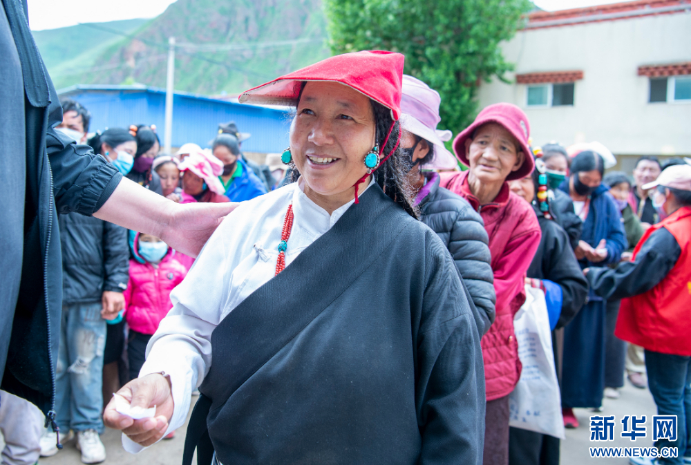 7月12日,群眾在西藏丁青縣西藏丁青縣尺犢鎮(zhèn)看完病后拿到組委會捐贈的藥品。新華網(wǎng) 旦增努布 攝