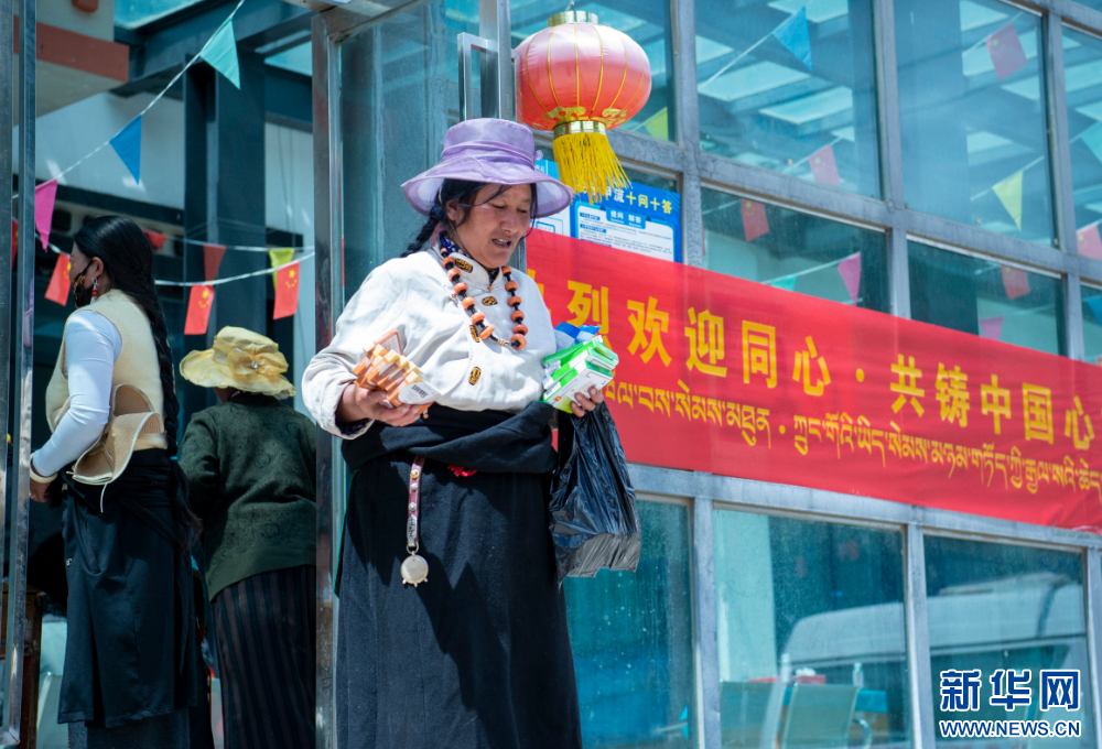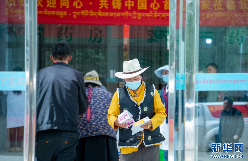 7月9日,群眾在西藏丁青縣人民醫(yī)院內(nèi)看完病后拿到組委會捐贈的藥品。新華網(wǎng) 旦增努布 攝