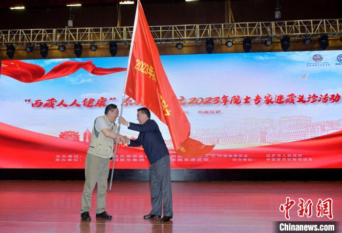 8月9日,“西藏人人健康”2023年院士、專家進藏義診活動啟動儀式上,西藏自治區(qū)副主席甲熱·洛桑丹增(圖右)為義診專家團隊代表授旗。李林 攝