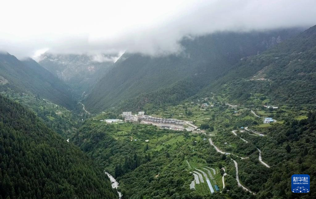 這是錯(cuò)那市貢日門(mén)巴民族鄉(xiāng)斯木村,畫(huà)面下方覆蓋地膜處為該村的莓茶種植基地。(無(wú)人機(jī)照片,7月28日攝)。新華社記者 旦增尼瑪曲珠 攝