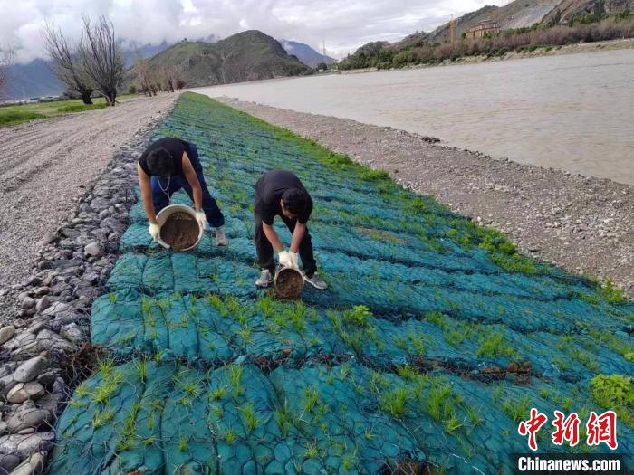 圖為工人們對(duì)生態(tài)袋進(jìn)行養(yǎng)護(hù)。中國水電基礎(chǔ)局西藏分公司供圖