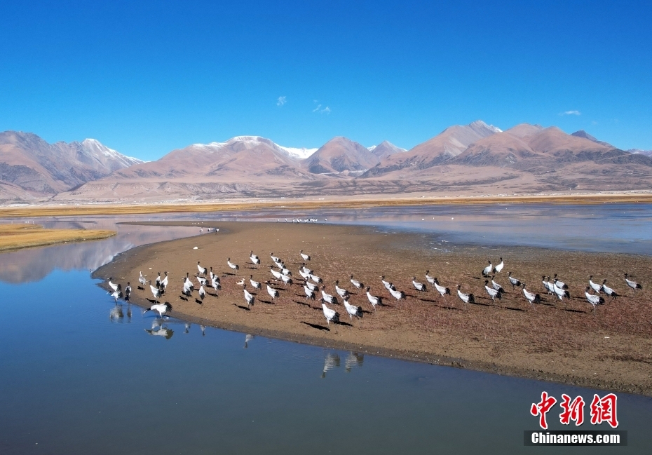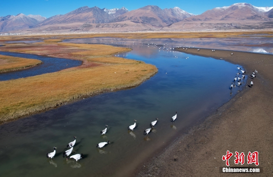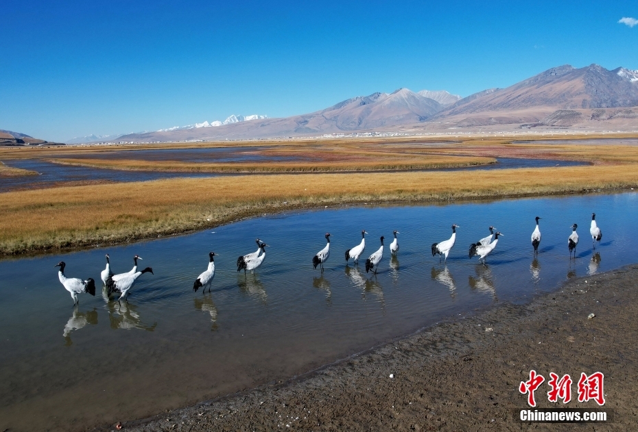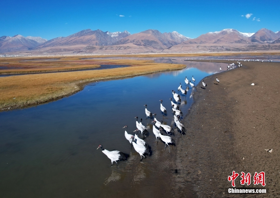 10月23日,成群的黑頸鶴在拉薩市當(dāng)雄縣阿熱濕地內(nèi)覓食。黑頸鶴是全球十五種鶴類中,唯一在高原地區(qū)繁殖和越冬的鶴類,屬中國(guó)國(guó)家一級(jí)保護(hù)野生動(dòng)物。(無(wú)人機(jī)照片)