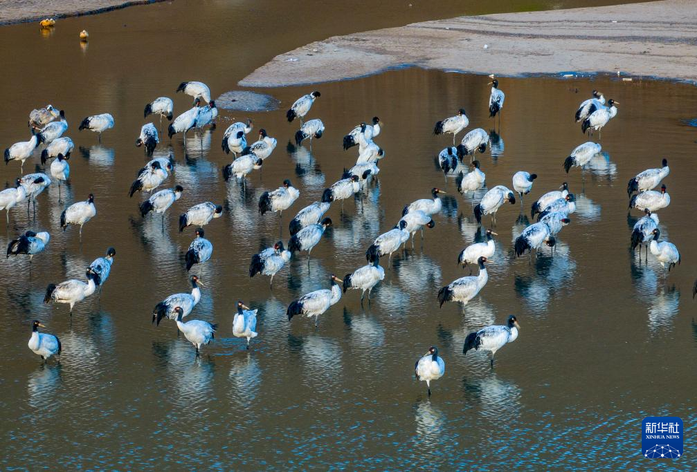 這是在拉薩市林周縣虎頭山水庫拍攝的越冬黑頸鶴(10月24日攝,無人機照片)。新華社記者 姜帆 攝