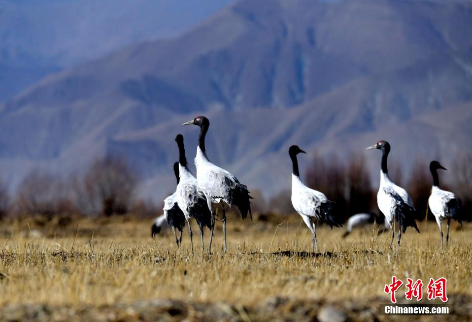圖為11月21日,西藏日喀則市桑珠孜區(qū)邊雄鄉(xiāng),黑頸鶴在田間覓食。李林 攝
