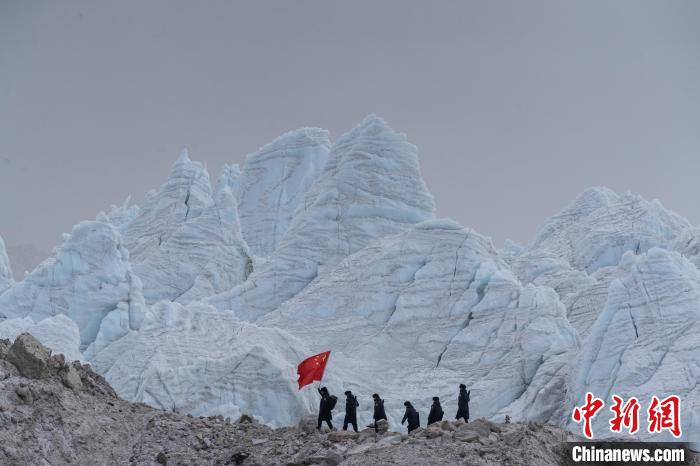 圖為普瑪江塘邊境派出所民警在海拔5600米的崗布冰川噴涂中國。郭遠(yuǎn)敬 攝