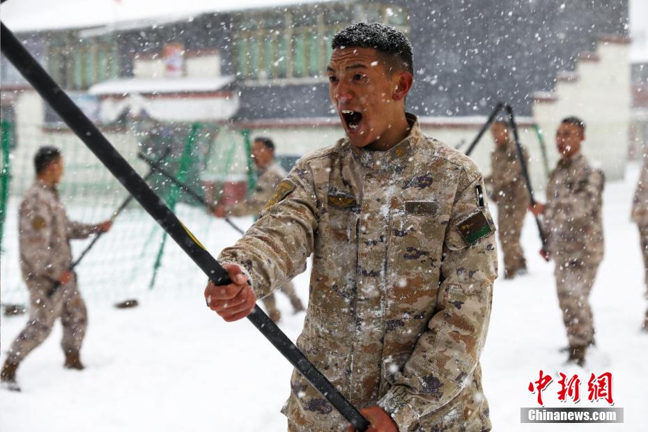 圖為西藏山南軍分區(qū)某邊防團(tuán)官兵在大雪中訓(xùn)練棍術(shù)。劉俊輝 攝