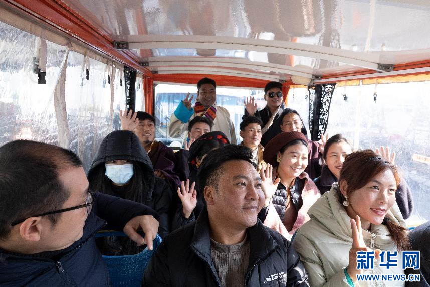 圖為墨竹工卡縣農(nóng)牧民帶表團(tuán)在南京高淳國(guó)際慢城景區(qū)觀光車(chē)內(nèi)合影留念(12月24日攝)。新華網(wǎng)發(fā) 李騰 攝