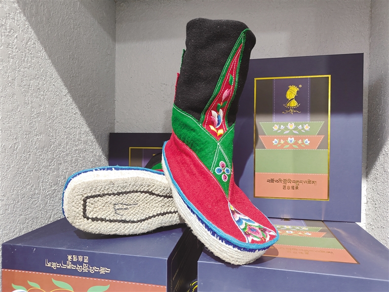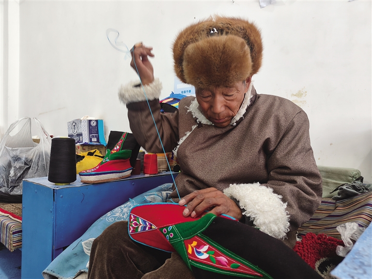 “藏靴樣式精美、花色靚麗,因材質(zhì)和花色的不同分為‘郭扎’‘郭朵’‘松巴’三種?!枪?jié)慶時穿,‘郭朵’‘松巴’可以日常穿,制作一雙藏靴需要一周左右的時間。這些藏靴不分左右,磨損后可以互換,還可以防潮防寒。”正在縫制藏靴的索朗頓珠雙手稍顯粗糲卻不失靈巧,他邊飛針走線,邊給記者介紹著手中的藏靴。厚而輕的鞋底、柔軟的靴面,五顏六色的絲線繡出栩栩如生的多瓣蓮花,加上氆氌制成的鞋面,一雙極具民族特色的藏靴展現(xiàn)在眼前。