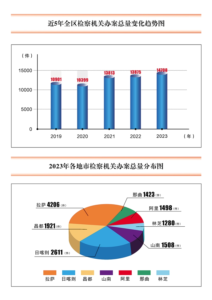 “2023年,全區(qū)檢察機(jī)關(guān)在自治區(qū)黨委和最高檢正確領(lǐng)導(dǎo)下,以習(xí)近平新時(shí)代中國(guó)特色社會(huì)主義思想為指導(dǎo),深入貫徹習(xí)近平法治思想、習(xí)近平總書記關(guān)于西藏工作的重要指示和新時(shí)代黨的治藏方略,全面貫徹黨的二十大精神、自治區(qū)第十次黨代會(huì)和十屆區(qū)黨委歷次全會(huì)精神、全國(guó)檢察長(zhǎng)會(huì)議精神,認(rèn)真落實(shí)自治區(qū)十二屆人大一次會(huì)議決議,自覺把檢察工作放到黨的治藏穩(wěn)藏興藏大局中謀劃推進(jìn),聚焦‘四件大事’聚力‘四個(gè)創(chuàng)建’,忠誠(chéng)依法能動(dòng)高質(zhì)效履職取得新成效。全年辦理各類法律監(jiān)督案件14708件,同比增長(zhǎng)6%。依法主動(dòng)辦案8030件,占54.6%,主動(dòng)辦案量首次超過被動(dòng)受理案件量?!拇髾z察’結(jié)構(gòu)持續(xù)優(yōu)化為56∶18∶7∶19,業(yè)務(wù)質(zhì)效穩(wěn)步提升?!?月8日下午,西藏自治區(qū)人民檢察院檢察長(zhǎng)夏克勤在西藏自治區(qū)第十二屆人民代表大會(huì)第二次會(huì)議上作工作報(bào)告。報(bào)告全面反映了西藏檢察機(jī)關(guān)一年來始終牢記“國(guó)之大者”,以實(shí)現(xiàn)“努力讓人民群眾在每一個(gè)司法案件中感受到公平正義”為目標(biāo),深入踐行“高質(zhì)效辦好每一個(gè)案件”,充分發(fā)揮檢察職能作用,在為大局服務(wù)、為人民司法、為法治擔(dān)當(dāng)中所做的主要工作,同時(shí)描繪了2024年的西藏檢察工作藍(lán)圖。