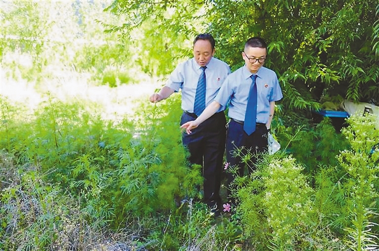 朗縣人民檢察院在辦理督促防治外來物種印加孔雀草行政公益訴訟案期間,檢察官對(duì)印加孔雀草的生長(zhǎng)區(qū)域進(jìn)行摸排。