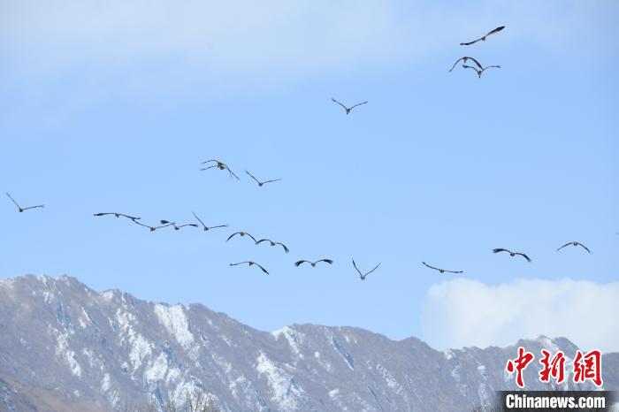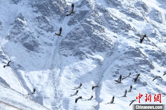圖為拉薩林周縣黑頸鶴保護區(qū)內,黑頸鶴在雪山翱翔。貢嘎來松 攝