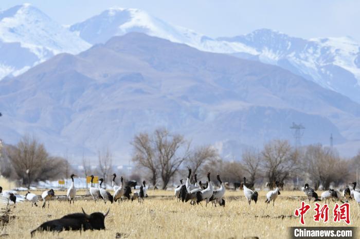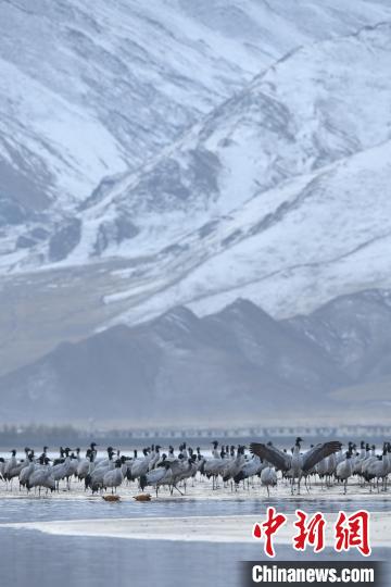 圖為拉薩林周縣虎頭山水庫,黑頸鶴正在覓食、嬉戲。貢嘎來松 攝