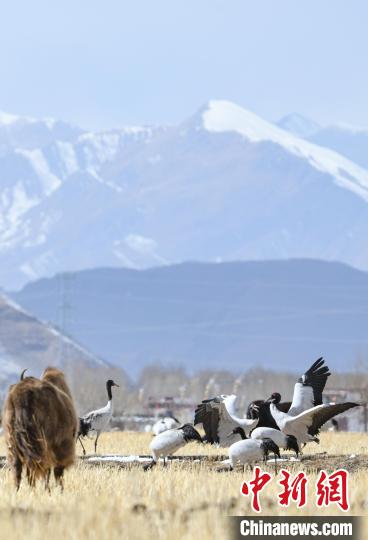 圖為拉薩林周縣黑頸鶴保護區(qū)內,黑頸鶴正在覓食、嬉戲。貢嘎來松 攝