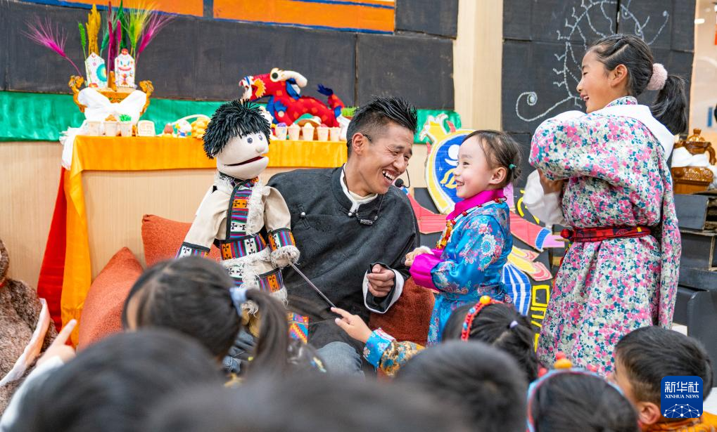 2月3日,手偶表演演員在拉薩的兒童藏裝派對上和孩子們互動(dòng)。新華社記者 丁增尼達(dá) 攝