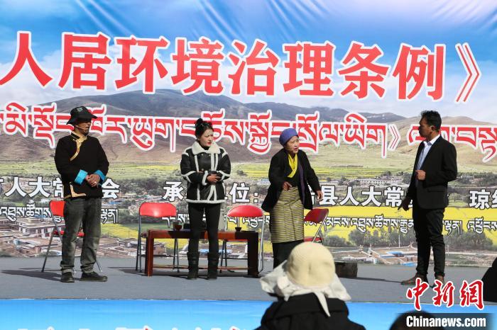 圖為瓊結(jié)縣藝術(shù)團(tuán)正在表演關(guān)于人居環(huán)境治理方面的小品。次旦卓嘎 攝