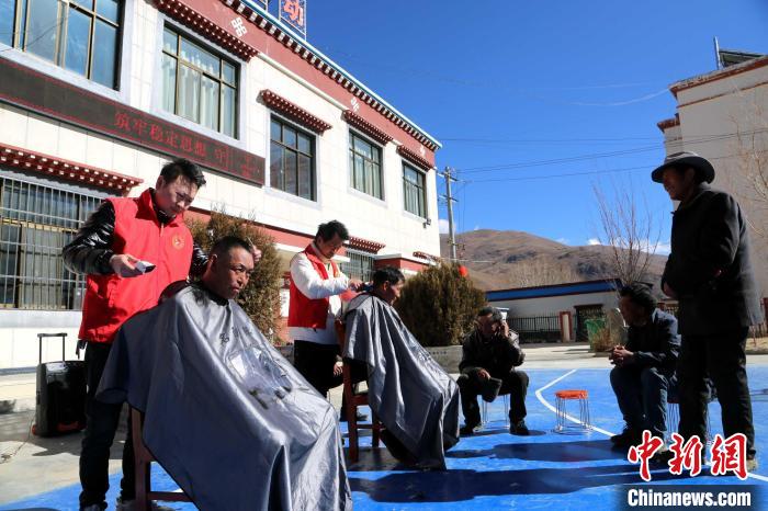 圖為理發(fā)店店長劉陽(左一)為民眾提供免費理發(fā)服務(wù)。倫珠澤仁攝