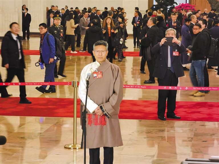 圖為3月7日上午,全國政協(xié)十四屆二次會議第二場“委員通道”集體采訪活動開啟。圖為住藏全國政協(xié)委員達瓦頓珠亮相“委員通道”并回答記者提問。