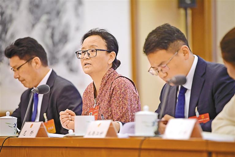 圖為3月7日,西藏代表團舉行全體會議,傳達學習習近平總書記在看望參加全國政協(xié)十四屆二次會議的民革、科技界、環(huán)境資源界委員并參加聯(lián)組會議時的重要講話,審議國務院組織法修訂草案,繼續(xù)審查計劃報告和草案、預算報告和草案。圖為尼珍代表在會上進行討論發(fā)言。 旦增西旦 攝