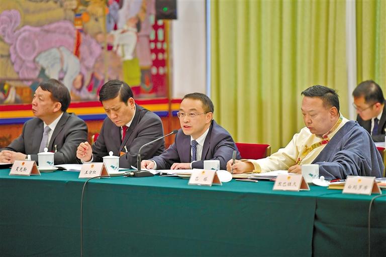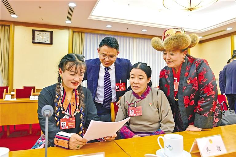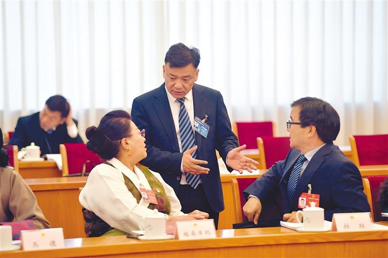 圖為西藏全國(guó)人大代表在會(huì)議間隙溝通交流。