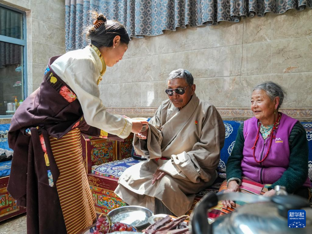 白瑪?shù)膶O女嘎桑玉珍(左)為他和老伴多吉卓瑪敬酥油茶(3月27日攝)。新華社記者 丁汀 攝