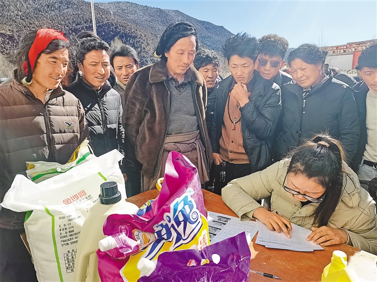 圖為芒康縣幫達鄉(xiāng)毛尼村群眾用積分兌換生活物資現(xiàn)場。記者 周婷婷 攝