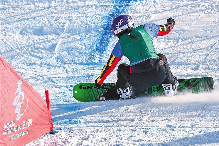 圖為2月19日,在內(nèi)蒙古烏蘭察布市涼城滑雪場舉行的第十四屆全國冬季運(yùn)動(dòng)會(huì)單板滑雪青年組女子障礙追逐賽中,中國西藏隊(duì)選手擁青拉姆正在比賽(資料圖片)。新華社記者 伍志尊 攝
