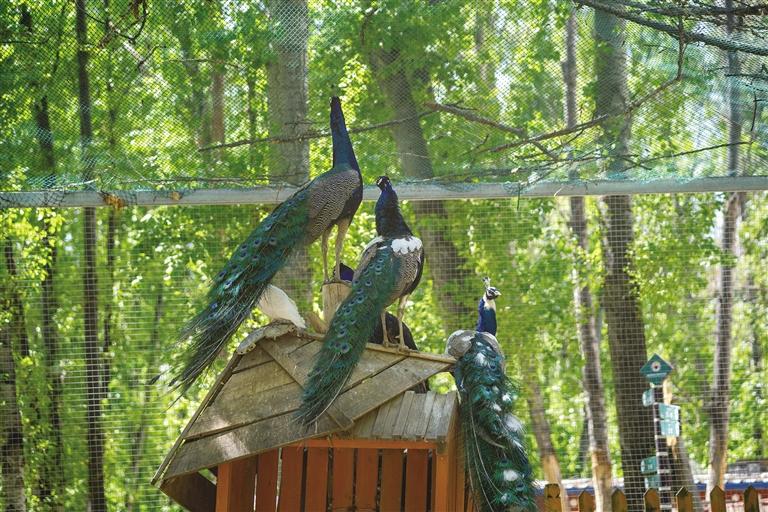 乘著觀光車前行,一路都被綠葉青草圍繞。觀賞完動(dòng)物,記者一行在動(dòng)物園內(nèi)的餐廳就餐,等待美食的過(guò)程中,點(diǎn)一杯咖啡或甜茶,看著藍(lán)天白云和滿眼綠意,不時(shí)還能聽(tīng)到孔雀啼鳴,別有一番滋味。