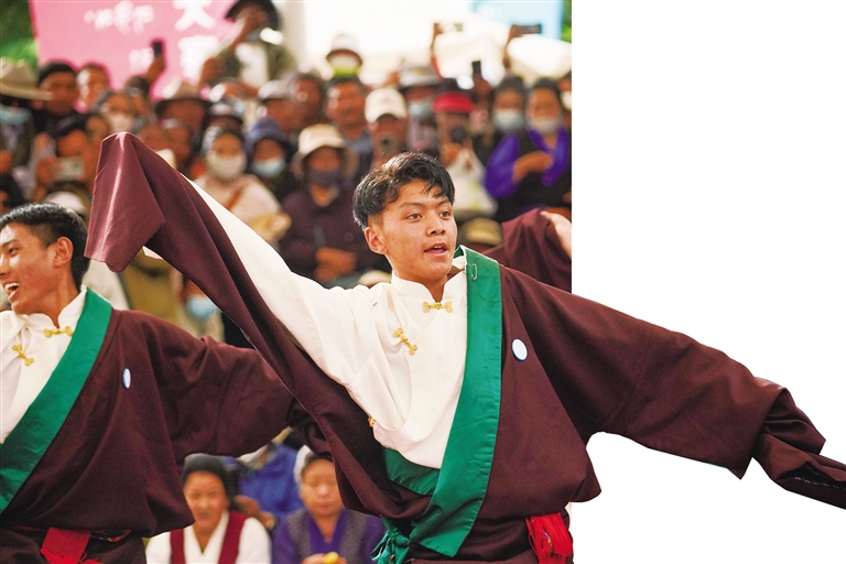 隨著音樂的響起,鍋莊舞大賽正式開始。堆龍文化活動中心朗瑪堆諧培訓班代表隊首先登場,他們帶來的節(jié)目《藏戲鍋莊舞美好生活贊歌 》,藏戲唱腔、動作優(yōu)美,展現了堆龍德慶區(qū)覺木隆藏戲的魅力,隨后,拉薩市第一職民族音樂舞蹈班代表隊帶來的節(jié)目《吉祥鍋莊》,以歡快活潑的曲目、輕快明亮的舞蹈身影撥動了全場觀眾的心弦,點燃了現場的氣氛,緊接著《黨恩似金橋》《果諧 薩迪齊噶崗》《宗秀 宗秀》等節(jié)目輪番上演,整場比賽精彩紛呈、氛圍濃厚,贏得臺下觀眾的陣陣喝彩聲和熱烈的掌聲。