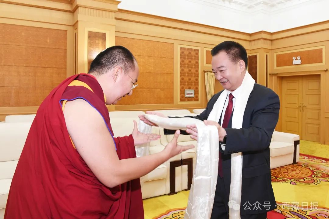 6月26日下午,自治區(qū)黨委書記王君正在拉薩會見班禪額爾德尼·確吉杰布。這是王君正與班禪額爾德尼·確吉杰布互獻哈達。記者 李洲 攝