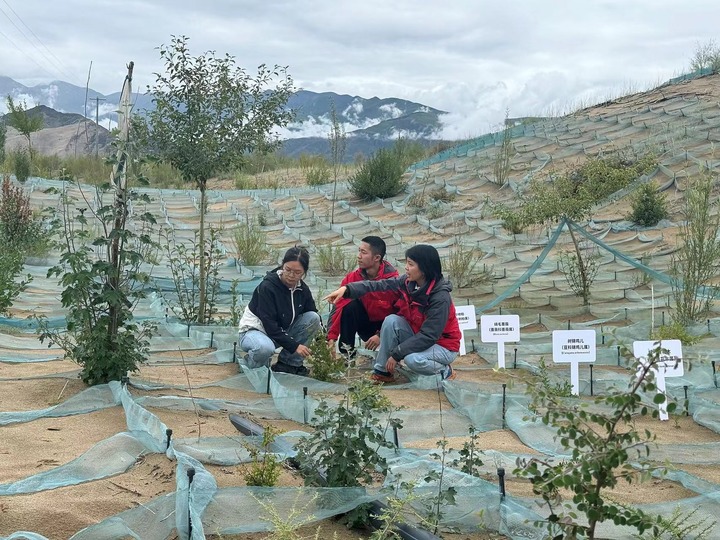 中國科學(xué)院成都山地災(zāi)害與環(huán)境研究所研究員周萍帶領(lǐng)研究生在西藏扎囊縣沙化土地生態(tài)治理綜合示范區(qū)開展沙地試驗樣方植被生長狀況監(jiān)測。新華社記者 顧天成 攝