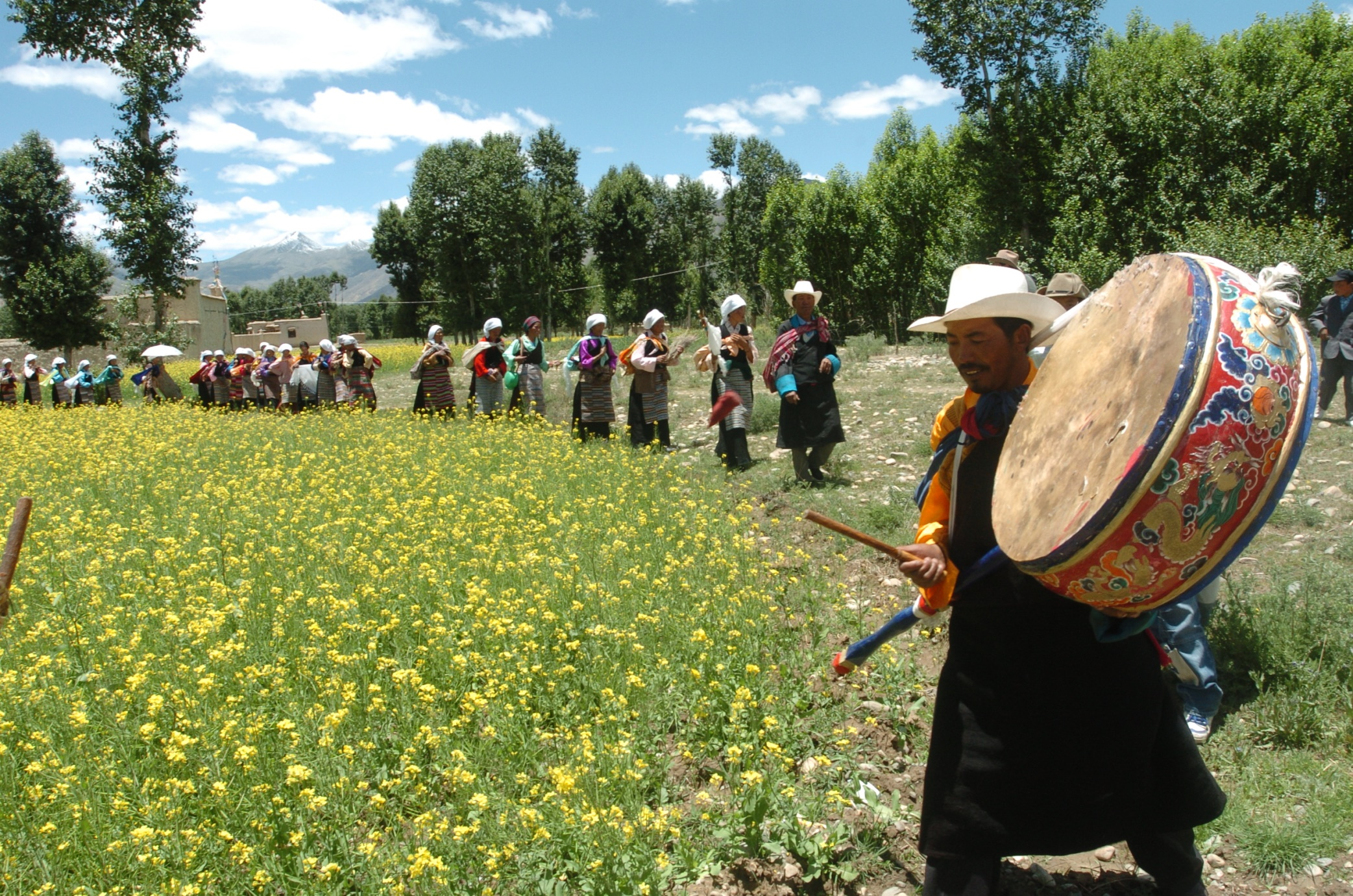 林周,藏語(yǔ)譯為“天然形成的沃土”,被譽(yù)為“拉薩的后花園”、“拉薩的糧倉(cāng)”,天然肥沃的土壤把林周縣分為兩種特殊的地貌,草原和耕地,養(yǎng)育了眾多的林周人。圖為林周縣群眾慶?!巴?jié)”。