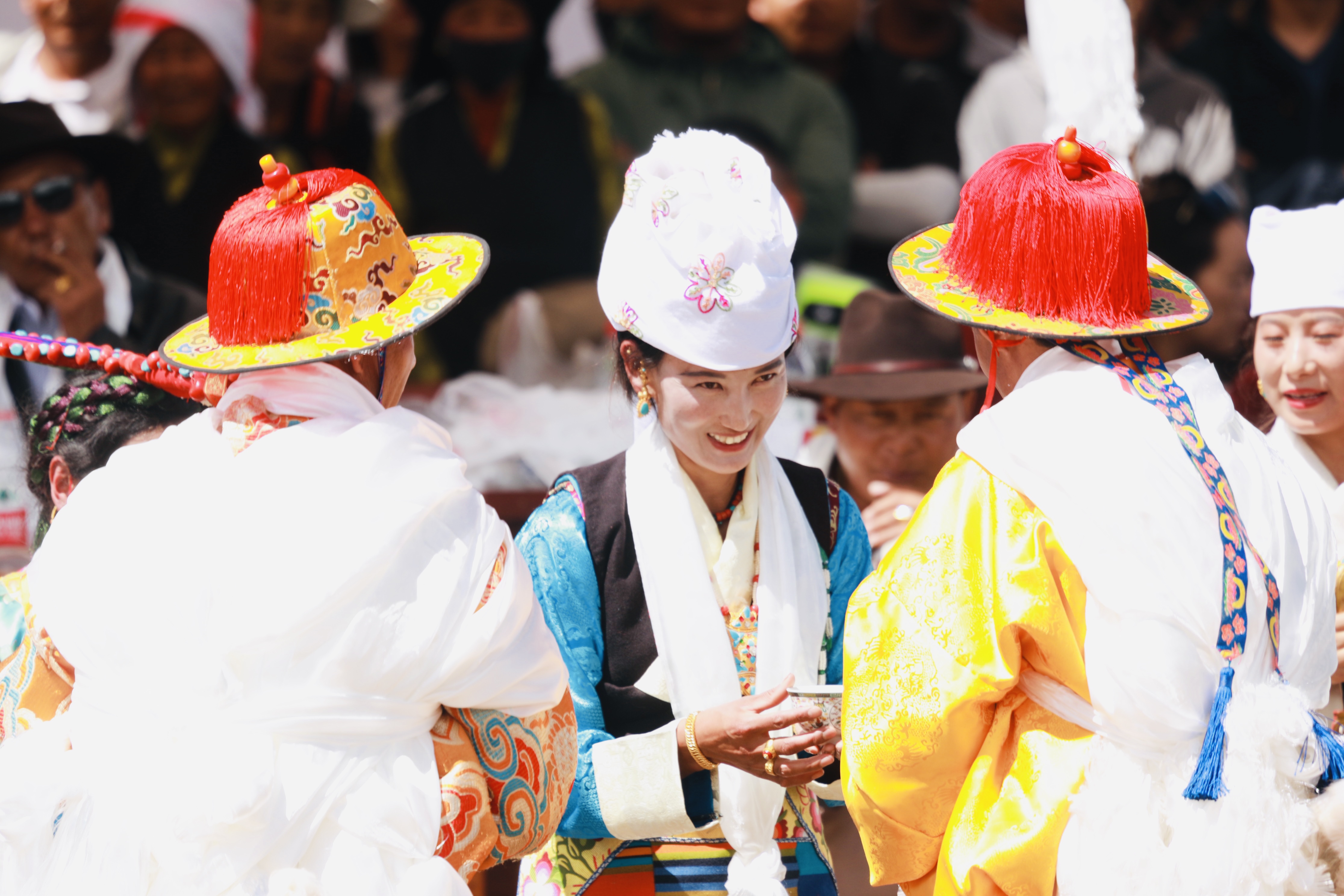 據(jù)悉,賽馬是西藏各地為慶祝豐收舉行“望果節(jié)”(賽馬節(jié))時(shí)的傳統(tǒng)慶典活動(dòng),是群眾最為喜愛(ài)、流傳最廣的體育運(yùn)動(dòng)之一。圖為沖許嘛(藏語(yǔ)意為“敬酒者”)為騎手唱歌、敬酒、敬茶。