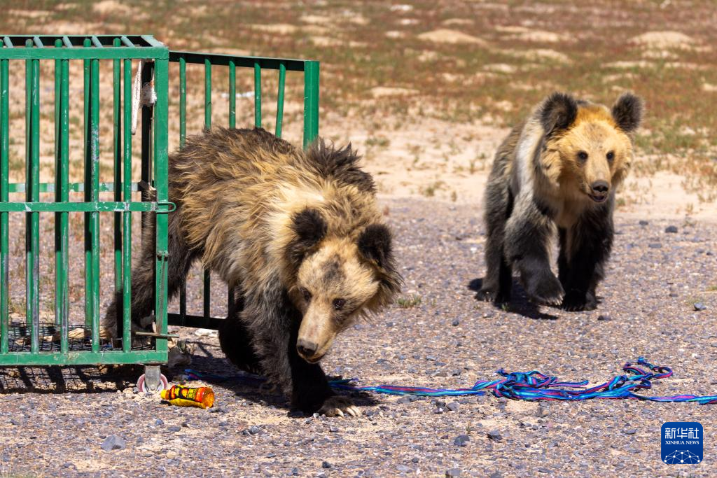 在西藏那曲市尼瑪縣的羌塘國家級自然保護(hù)區(qū)核心區(qū),被放歸的棕熊母子走出籠子(8月30日攝)。新華社記者 姜帆 攝