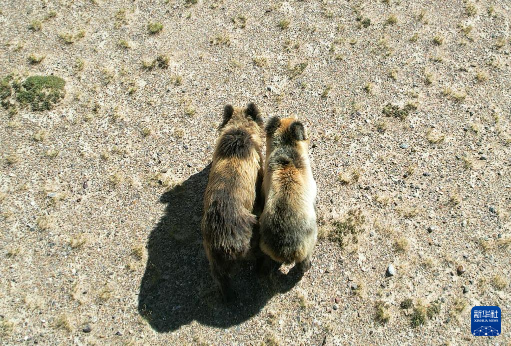 在西藏那曲市尼瑪縣的羌塘國家級自然保護(hù)區(qū)核心區(qū),被放歸的棕熊母子走向大自然(無人機(jī)照片,8月30日攝)。新華社記者 劉詩平 攝