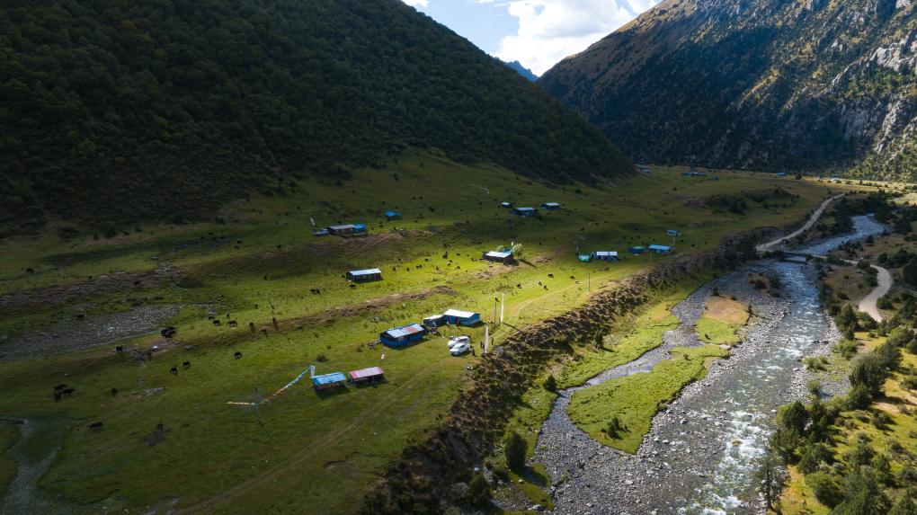 貢喬熱旦家夏季牧場的全貌(無人機照片,9月4日攝)。新華社記者 丁增尼達(dá) 攝