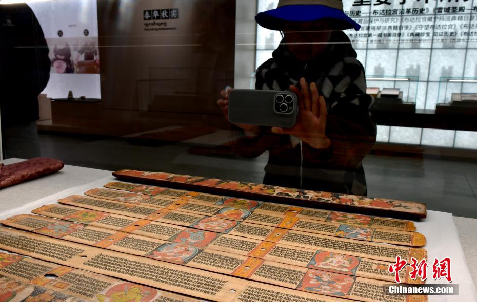 以“見證與守望——鑄牢中華民族共同體意識主題展”為主題的展覽近日亮相西藏自治區(qū)拉薩市布達(dá)拉宮雪城珍寶館。本次主題展精選100余件文物珍品,展覽通過文物、古籍及布達(dá)拉宮的傳承與發(fā)展,講述各民族交往交流交融的故事。圖為1月2日,觀眾拍攝展覽中的13世紀(jì)《般若八千頌》貝葉經(jīng)寫本。中新社記者 李林 攝