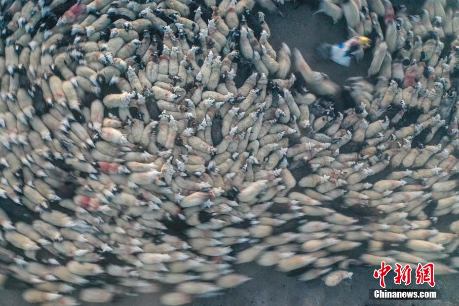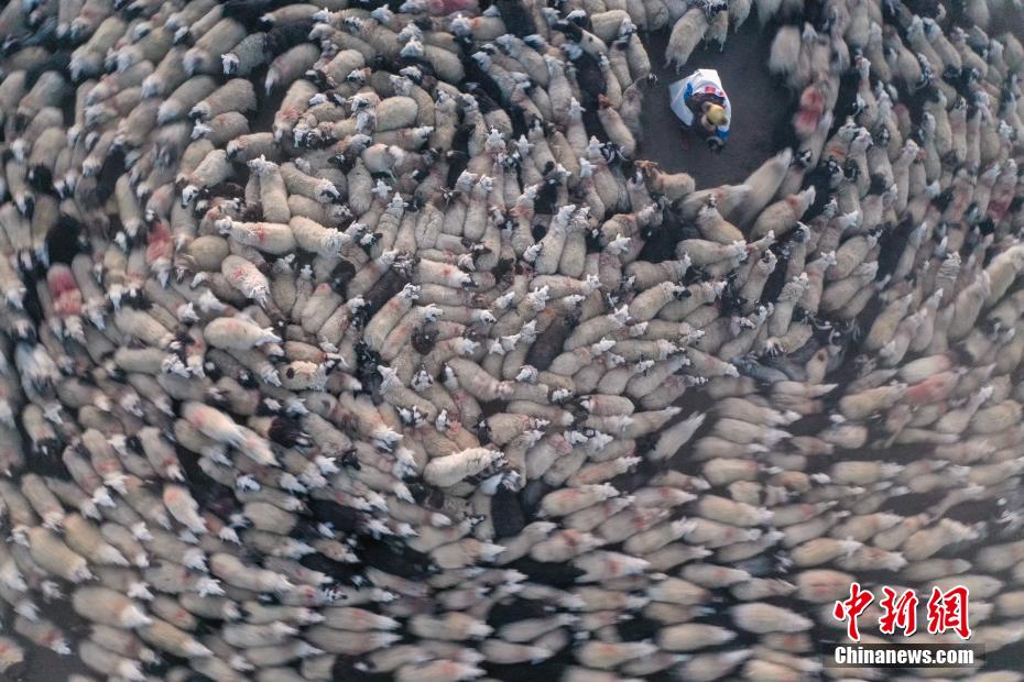 2月7日,西藏山南市浪卡子縣推瓦村1000多只羊通過普莫雍錯冰湖,前往湖心島。據(jù)悉,位于西藏山南市浪卡子縣的推瓦村,平均海拔約5070米,是世界上海拔最高的行政村,以牧業(yè)為主。由于推瓦村海拔高、夏季短,草場無法為羊群提供充足的過冬飼料,因此,每年高原最冷的時候,推瓦村牧民會把羊群趕到普莫雍錯水草豐茂的湖心島,依靠島上的草料度過最寒冷的冬期。圖為羊群到達湖心島。(無人機照片)中新社記者 貢嘎來松 攝