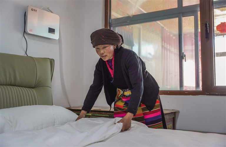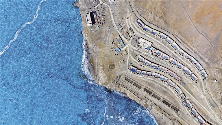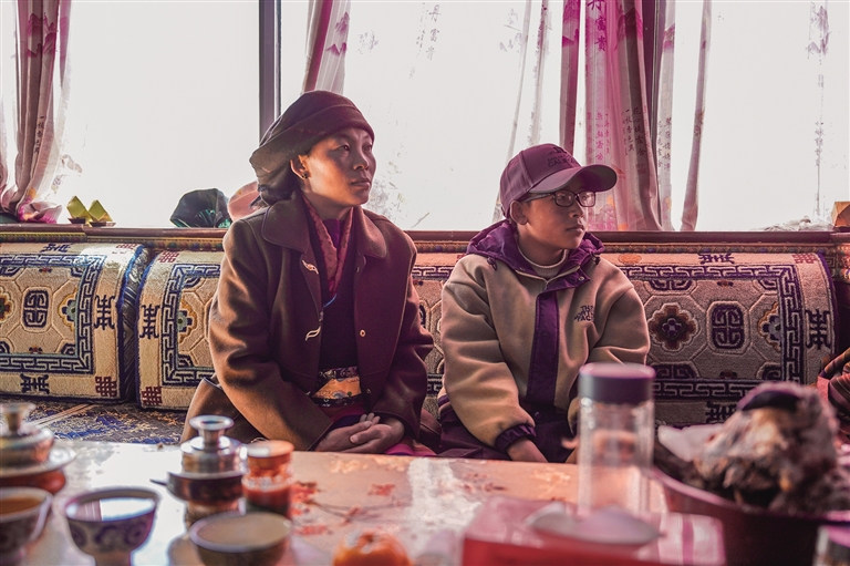 當(dāng)日,天空晴朗,在廣袤無(wú)垠、無(wú)樹(shù)木遮擋的曠野上,稍起一陣疾風(fēng),便會(huì)揚(yáng)起一層薄薄的黃沙。從村委會(huì)出發(fā),沿著冰湖畔的水泥小路前行,很快就來(lái)到了村民倫珠曲珍的家。一進(jìn)屋,厚實(shí)的木門便將凜冽的寒風(fēng)擋在了門外?!翱煺?qǐng)進(jìn),這幾天風(fēng)沙有點(diǎn)大,普莫雍措都沒(méi)以前藍(lán)了。”倫珠曲珍一邊關(guān)門一邊熱情地笑著說(shuō)道。