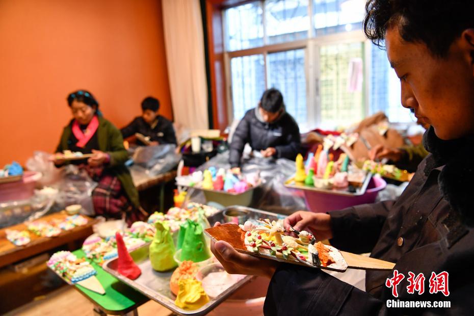 2月15日,手工藝人在拉薩制作酥油花。隨著藏歷新年臨近,酥油花在拉薩年貨市場上熱銷。酥油花在藏語中稱為“孜扎”,是藏族民眾家庭中必備的年貨之一。
